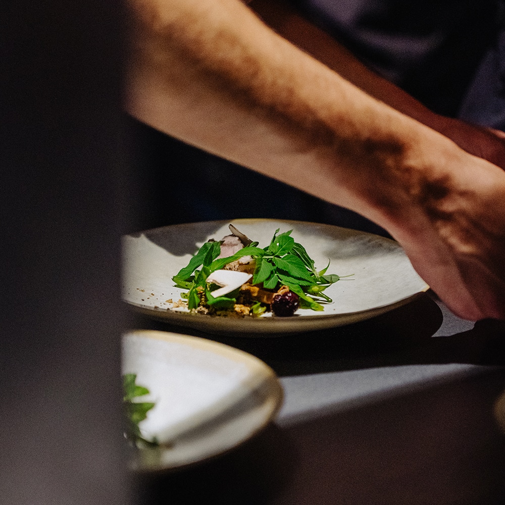 Chaque repas est un voyage culinaire, œnologique, complété d’extractions et jus issus de plantes sauvages ou cultivées. Une quête de l’équilibre, d’une gastronomie durable et respectueuse de ce que la nature a à offrir.