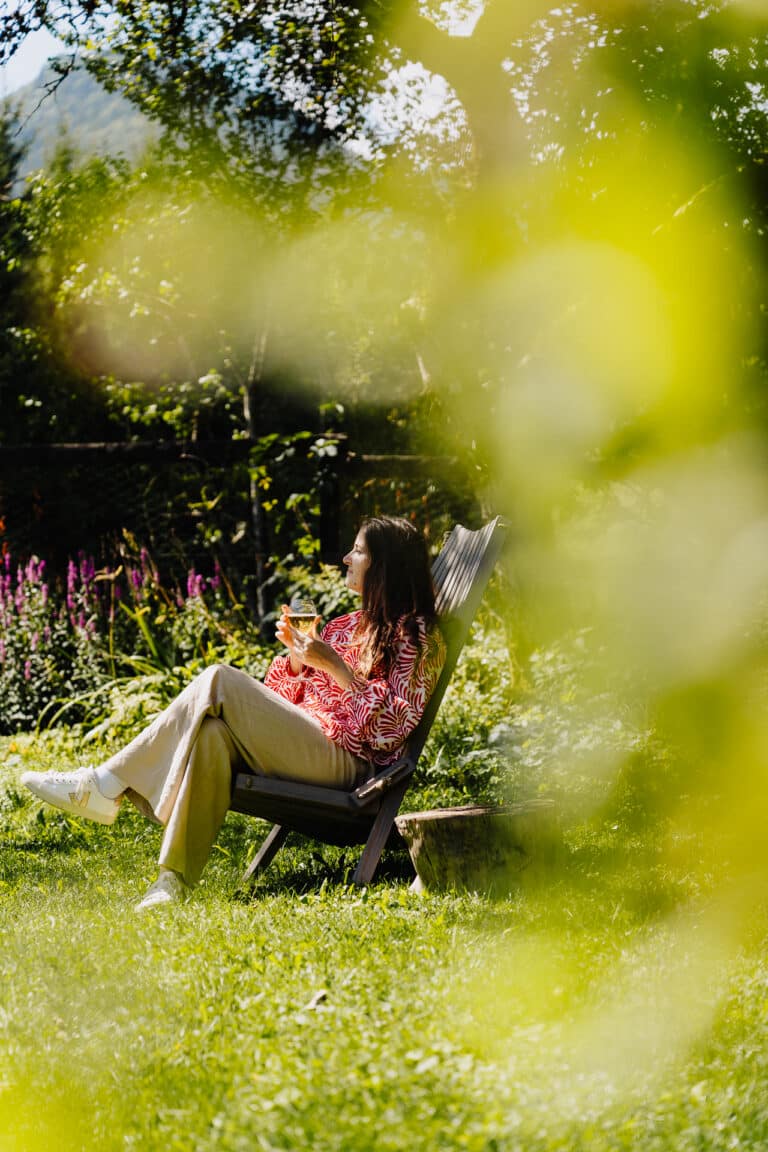 Le jardin, planté de vieux pommiers et d’herbes aromatiques, embaume l’air au fil des saisons. Le murmure de la rivière, le chant des oiseaux, le tintement des cloches des vaches en alpage, les objets anciens soigneusement choisis… Tout ici invite à la contemplation et à la reconnexion à l’essentiel.